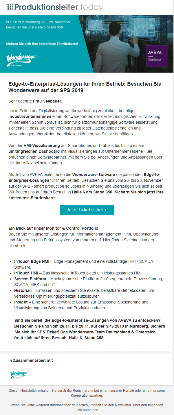 Standalone-Mailing über die Präsentation der Wonderware-Software, die Ihnen passende Edge-to-Enterprise-Lösungen für Ihren Betrieb bietet, auf der SPS (Smart Production Solutions) in Nürnberg.