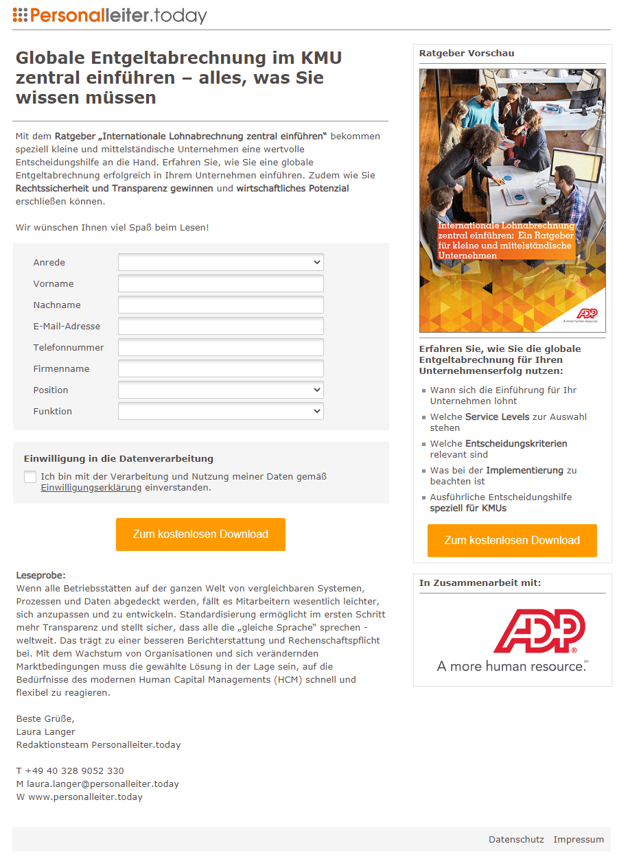 Doch welche Lösung ist die richtige Wahl für Ihr Unternehmen und warum? Der Ratgeber „Internationale Lohnabrechnung zentral einführen“ hilft Ihnen eine informierte Entscheidung zu treffen. In freundlicher Zusammenarbeit mit unserem Themensponsor ADP.