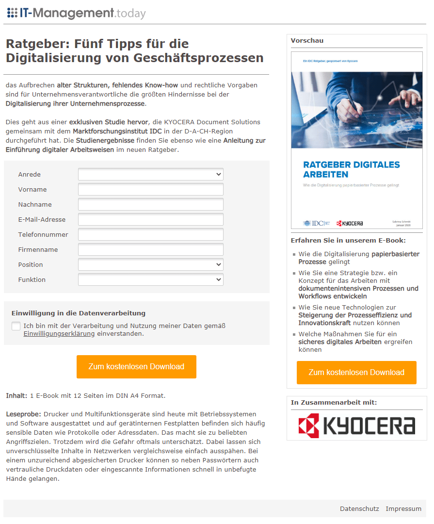 Dies geht aus einer exklusiven Studie hervor, die KYOCERA Document Solutions gemeinsam mit dem Marktforschungsinstitut IDC in der D-A-CH-Region durchgeführt hat. Die Studienergebnisse finden Sie ebenso wie eine Anleitung zur Einführung digitaler Arbeitsweisen in unserem neuen Ratgeber.