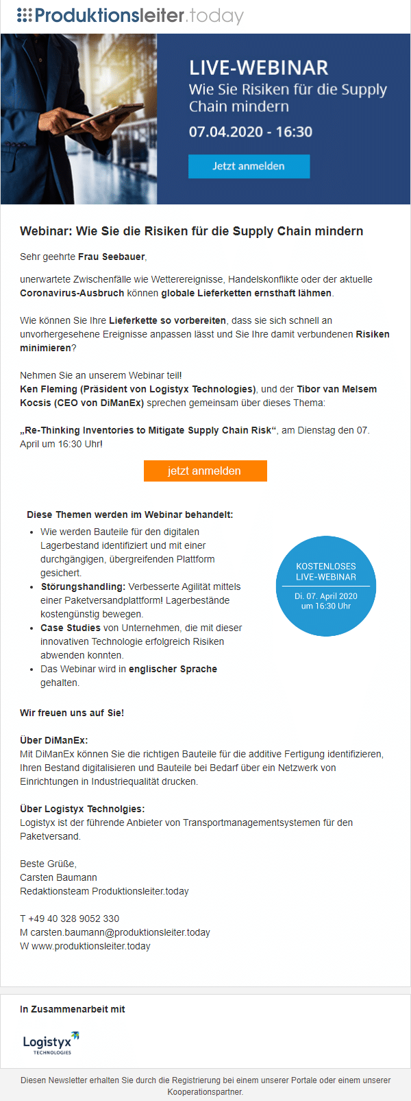 View Larger Image „Webinar: Wie Sie die Risiken für die Supply Chain mindern“ [2020]2020-09-07T09:17:14+02:00 Mailing zum Thema Mindern von Risiken für die Supply Chain Standalone-Mailing, um das Live-Webinar „Wie Sie die Risiken für die Supply Chain mindern“ von Logistyx zu bewerben. Project Details Kategorien: Mailings Tags: LogistyxSupply Chain