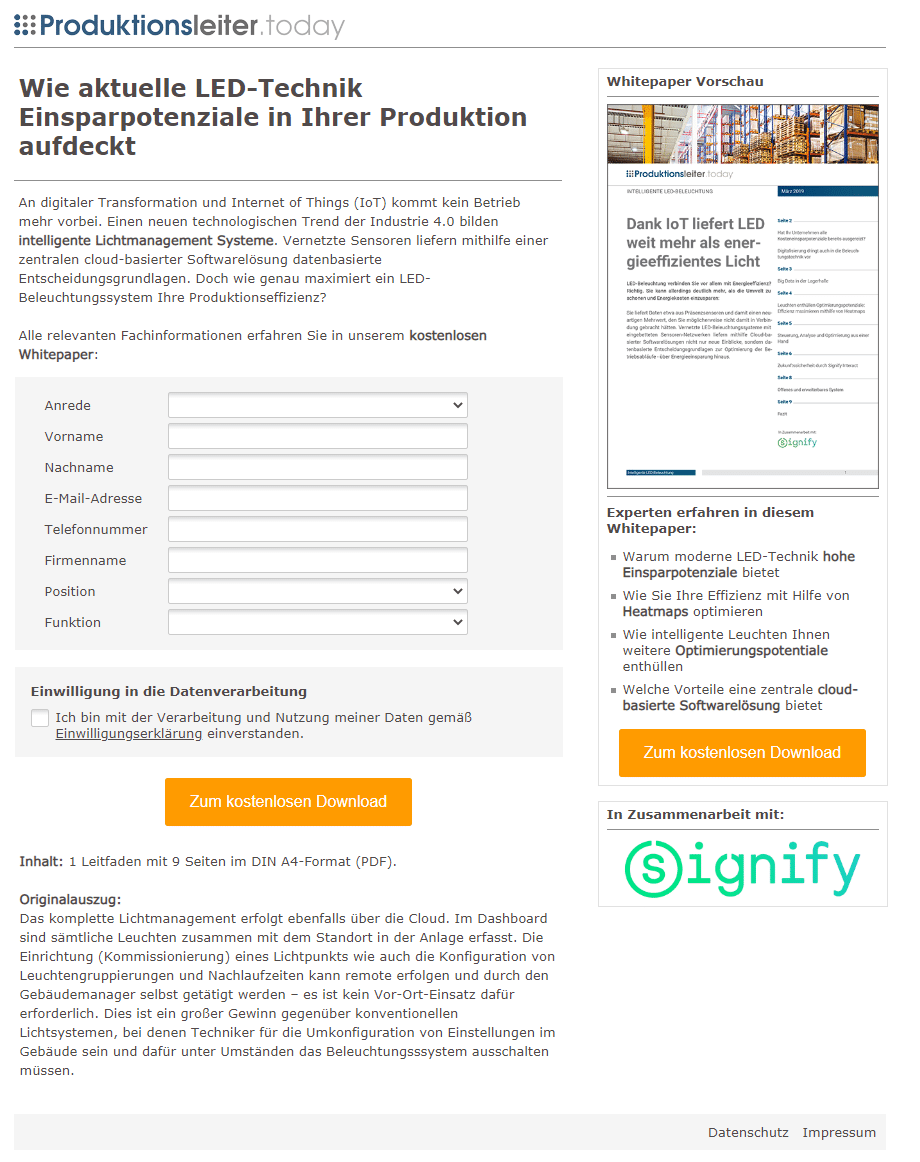 Wie Sie Ihre Produktionseffizienz durch ein LED-Beleuchtungssystem maximieren und Ihre digitale Transformation mit IoT vorantreiben, erfahren Sie in unserem Whitepaper. In Zusammenarbeit mit Signify.