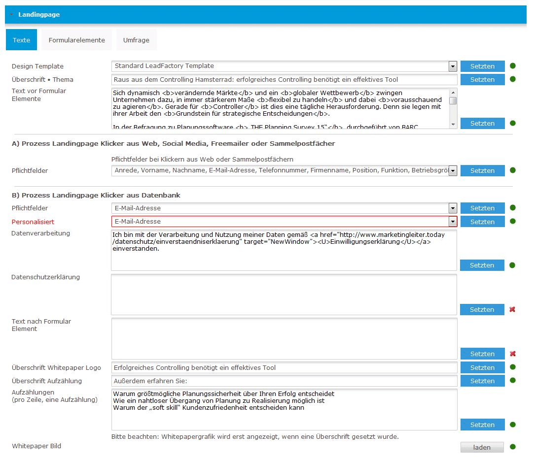 Unsere Landingspages erkennen aus welchem Kanal die Klicks kommen und blenden dynamisch die definierten Eingabefelder ein. Kommt der Interessent aus einem Posting oder Fachartikel (Blog, XING Gruppenposting, LinkedIn Gruppenposting, Pressemeldung oder Suchmaschinenergebnis) auf die Landingpage, werden – da noch keine Daten des Interessenten vorhanden sind- alle im vorherigen Schritt definiterten Felder abgefragt. Handelt es sich um Interessenten, die bereits bei uns registriert sind, werden nur die Daten, die zusätzlich abgefragt werden sollen, erhoben. Die Formulare haben also weniger Eingabefelder („sind kürzer“) und konvertieren besser.