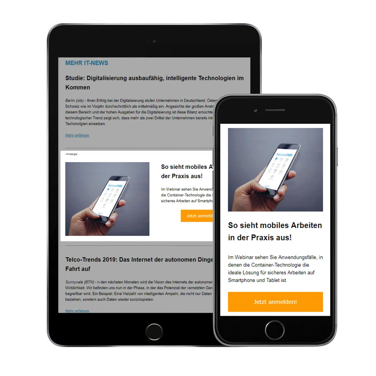 Newsletter-Native-Ads sind Display-Ads im Layout eines Newsletters des Business.today Networks. Die Newsletter sind mit einem der BTN-Mediamarken gebrandet und erreichen in 5 relevanten Verticals jeweils bis zu 70.000 Empfänger: IT & Software | Personalwesen | Marketing & Vertrieb | Industrie & Fertigung | Business allgemein.